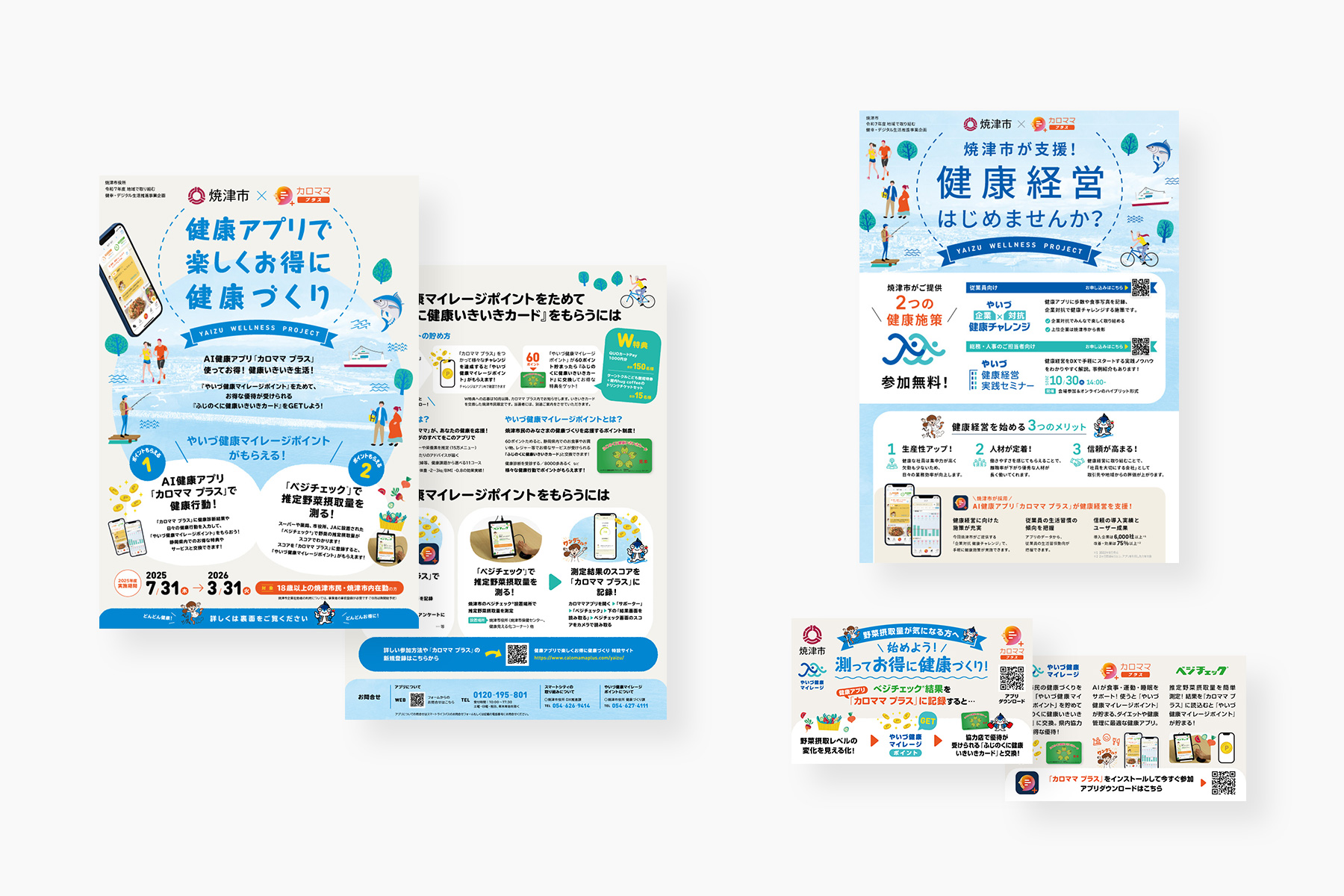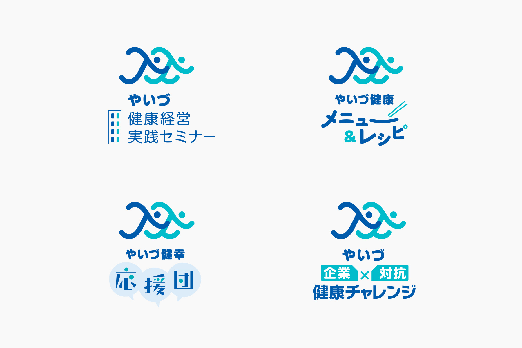 市民・事業者・行政が一体となって施策を推進するため、やいづ健幸関連事業の広報物にこの共通シンボルマークを使用し、各施策を統一感のある形で発信。参加事業者や団体にも共通シンボルマークの利用を推奨し、地域連携への参加姿勢を示し社会的評価や企業価値の向上にもつなげていきます。